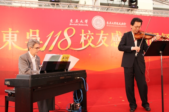 本次餐會更特別邀請音樂系104級校友賴思妤、102級宋宜蓁與彭廣林主任上台演奏。校友賴思妤在2015年的八仙塵爆中嚴重燒傷,復原過程飽受身心折磨,極為艱困。原以為沒有機會再次演奏音樂,但有著身邊師長、朋友不斷的陪伴鼓勵以及東吳校友們的募款幫助,讓她一步步走出低谷,復原情況也漸漸好轉。這次能與學姐及彭教授一同站上舞台,校友賴思妤展現過人毅力與勇氣,用音樂撫慰人心。