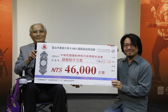 此外,商學院EMBA亦不忘負起社會責任,將活動募款贈予「中華民國運動神經元疾病病友協會(漸凍人協會)」鼓勵漸凍病友,即便身處絕境,仍滿懷信心與希望,「堅持到底,永不放棄」致力使這個社會共善與共好。這是東吳校史上重要的一刻,戈13誓必延續光榮傳統,用體力、耐力、意志力,透過雙腳貫徹「理想、行動、堅持、超越」,傳承榮耀。