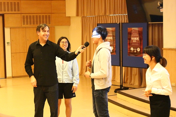本校英文系年度盛事同步口譯成果展於107年5月9日星期三在外雙溪校區正式「登臺獻譯」,結合「教你如何展現舞台魅力」主題,邀請表演大師蕭忠文先生及演講能手Paul Sharpe先生分享在講台上如何吸引人的訣竅,同時進行「中譯英」與「英譯中」同步口譯。