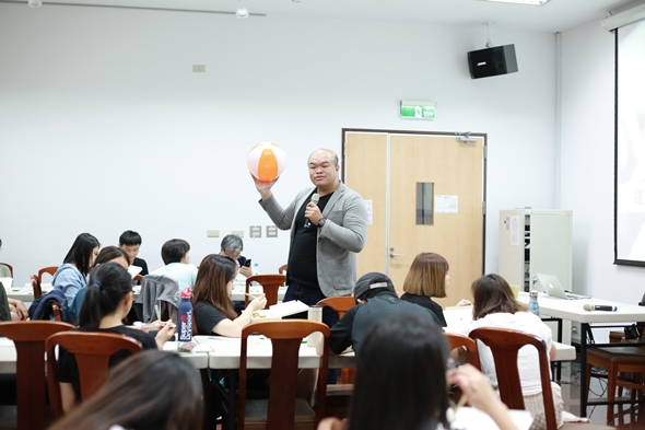 為了將無形的「溝通」具象化,曾培祐老師帶了一顆球,將話語比喻成一顆球,不斷地在陳述者與聆聽者之間拋接。他設計了一個情境,讓同學們現場對話、拋接球。若話語讓聆聽者不舒服或不同意,聆聽者可以選擇不接,那麼陳述者必須修正,直到聆聽者接球為止。「有效的溝通,必須隨機應變。」曾老師一再叮嚀同學。