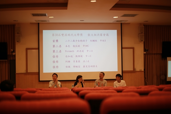 決審會議一開始,作家廖玉蕙表示,這次的稿件裡有很多題材很好、文字清暢、意念明朗的作品。作家焦桐認為,散文是Non-fiction,習慣將它設定為非虛構文類,在評審過程中會將佈局、結構、修辭列入評分標準。而作家陳栢青(本校中文系校友)回憶自己當年也是坐在台下的投稿者,當時的評審正是廖玉蕙和焦桐,很榮幸這次以另一種形式與兩位前輩坐在一起。很懷念曾經在學校學習寫作的時光,看著這次學弟妹的作品,覺得「香火後繼有人了,很開心!」