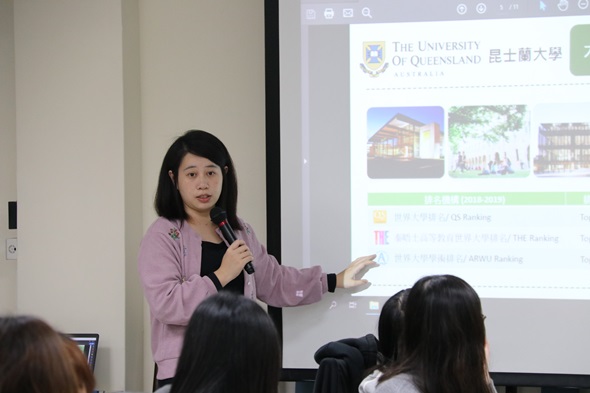 「每個學長姐參加後都讚不絕口!」國際事務中心黃敏淳老師向台下同學介紹專題課程,內容分為:GE(一般英文)、EAP(學術英文)、EIBC(商業英文)。其中GE是開課後才會做分級測驗;EAP著重IELTS聽說讀寫技巧;EIBC則強調商用英語寫作技巧與會議口說簡報技巧等。平日裡白天是上課時間,下午則由同學們自行規劃。除了上述課程以外,每日課後ICTE-UQ另有Skill-up免費課程,讓同學能更加靈活運用生活英語。校內設施也一應俱全,有健身房、藥局、醫院、銀行等日常設施,住宿的部分將由UQ安排寄宿家庭。